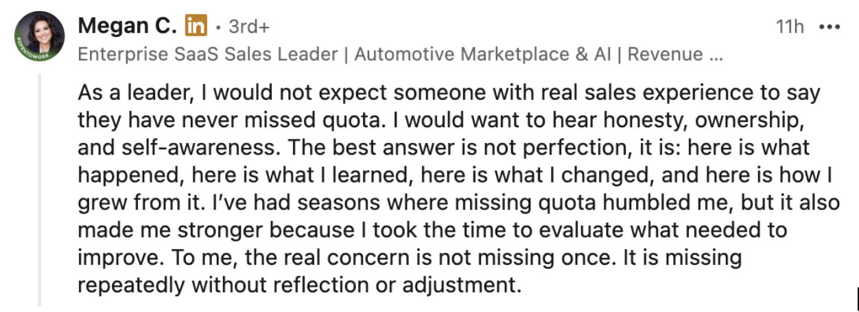 Many candidates worry they don’t have strong examples. Especially if they missed quota or went through a difficult year.